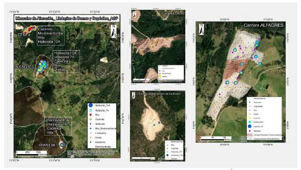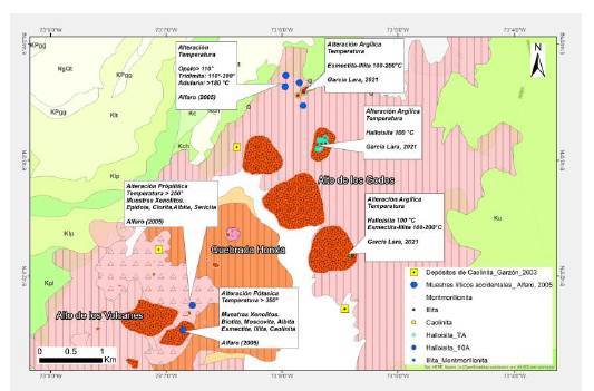 Se identificaron minerales arcillosos relacionados con alteración hidrotermal en el sector Alto de los Godos-domo SE y en las canteras de ALFAGRES y CEMEX. En varios puntos, estas ocurrencias señalan diferentes intensidades de alteración argílica por la presencia de minerales arcillosos tipo esmectita, correspondientes a la asociación mineral del grupo de las zeolitas, y argílica intermedia por minerales del grupo de caolín. De otra parte, la presencia de capas de illita y esmectita (I/E) puede relacionarse con una facie inicial de alteración fílica. En la Figura 3 se muestran los sectores muestreados y se representan con círculos de colores de diferentes tamaños los minerales arcillosos identificados en cada uno de los puntos de muestreo.