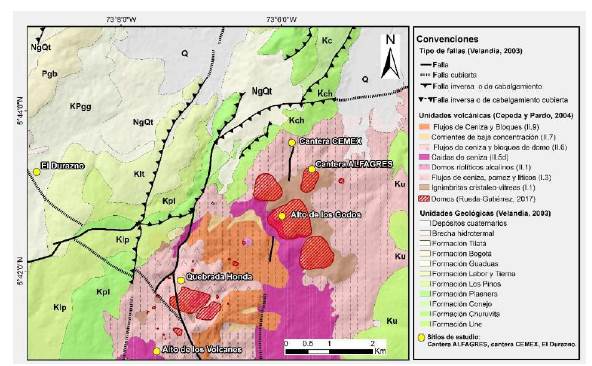a) Inicialmente, se realizó una compilación de afloramientos de unidades volcánicas y domos en sitios con posibilidades de acceso e ingreso a partir de publicaciones previas, imágenes de Google Earth y recorridos preliminares en campo. Las mejores condiciones para recolectar muestras se encontraron en sitios como zonas accesibles desprovistas de vegetación, canteras de explotación y cortes en taludes de carretera. En esta etapa se determinó que las mejores posibilidades estaban en el sector del Alto de los Godos (domo NW, domo Central, domo SE) y al norte de esta área, en las canteras CEMEX (Rincón de Vargas), cantera ALFAGRES (Venta del llano) y El Durazno; por esta razón, se gestionaron allí los permisos de acceso, y, en dos campañas subsecuentes, se recolectaron muestras de domos y depósitos piroclásticos.