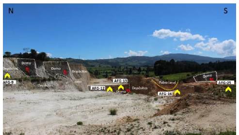 Finalmente, en el sector Alto de los Godos, donde se concentra la mayor parte de los datos de esta investigación, se han identificado cinco grandes elevaciones (estructuras dómicas) entre 2570 y 2770 m s.n.m. (domo NW, domo Central, domo SE, domo SW y criptodomo Matarredonda) (Rueda-Gutiérrez, 2020). En cuanto a los depósitos piroclásticos, existen secuencias expuestas en los sectores conocidos como cantera ALFAGRES (referenciada también como "criptodomo Matarredonda") y cantera CEMEX, sector último en el cual Suárez (2016) realizó la estratigrafía de ocho unidades volcanoclásticas.