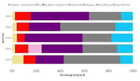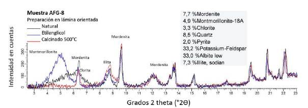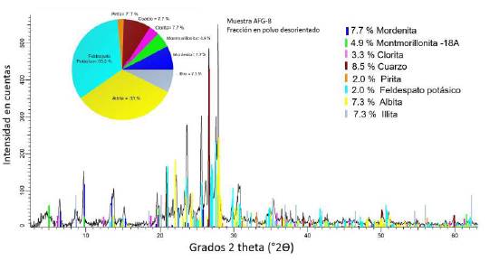 En las muestras de los depósitos piroclásticos del frente Guarruz se identificaron feldespatos (albita, anortoclasa y en menor proporción sanidina), cuarzo, caolinita, illita, montmorillonita-14 Å y ocasionalmente halloisita 7Å. En el ensayo en lámina orientada se constató la presencia de arcilla esmectita (montmorillonita), que se expande al impregnarse con etilenglicol. La agudeza e intensidad de las señales del difractograma evidencian un alto grado de cristalinidad. Las muestras obtenidas se pueden correlacionar con las unidades Cruz de Murcia (Ucm) y Quebrada Honda (Uqc) descritas por Suárez (2016). Según el autor, estas unidades están fuertemente argilizadas y están cortadas por "inyecciones hidrotermales", las cuales presentan halos de alteración color naranja y rojo; estas unidades son interpretadas como depósitos de corrientes de densidad piroclástica concentradas, ricas en pómez, cuyo origen fue un centro volcánico en el que ocurrió rebosamiento. Según Suárez (2016), la alteración de las rocas es producto de procesos de meteorización a los que han estado expuestos los fragmentos vítreos y cristalinos (solo feldespatos potásicos), que se han transformado en minerales del grupo de la arcilla como la caolinita. No obstante, la caracterización de los minerales de arcilla del sector de CEMEX-frente Guarruz señala también una alteración hidrotermal. La asociación mineralógica en estas muestras corresponde a albita (A), cuarzo (Q), caolinita (K), Illita 2M1 (I) y esmectita (Sm). Teniendo en cuenta la clasificación de la mineralogía de alteraciones en sistemas hidrotermales propuesta por Corbett y Leach (1998), esta asociación mineralógica puede clasificarse dentro del grupo de illita-caolinita (I-K), y está relacionada con fluidos con un pH en el rango 4-6; en este grupo, los minerales de illita coexisten con minerales del grupo caolín de pH 4-5, dependiendo de la temperatura y salinidad del fluido.