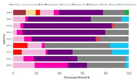 Los depósitos piroclásticos del sector ALFAGRES se caracterizan por tener una alteración superficial que se evidencia en coloraciones blancas-grises a amarillas-rojizas en algunas zonas de fracturas. Según el análisis de DRX en agregado desorientado, las principales fases cristalinas corresponden a cristales de feldespato (albita, sanidina, anortoclasa), cuarzo y, en menor porcentaje, halloisita, en todas las muestras. En el tratamiento de lámina orientada se logró confirmar la presencia de halloisita 7 Å, halloisita 10 Å y caolinita, con excepción de la muestra AFG-8 que fue tomada en la zona donde las rocas presentan alternancia entre color blanco y amarillento que atraviesa de forma vertical los depósitos analizados; en este punto se identificaron otros minerales tales como mordenita, illita 2M1, montmorillonita y clorita.