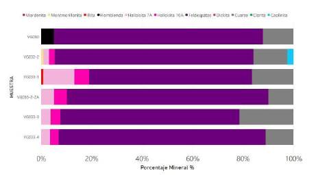 Al integrar las observaciones en campo y los análisis petrográficos y de difracción de rayos X (DRX), se identificó la existencia de asociaciones mineralógicas de los grupos de las caolinitas y zeolitas, típicas de una alteración argílica y argílica intermedia con fluidos en condiciones de pH ácido en el rango de 4,5 a 7.
