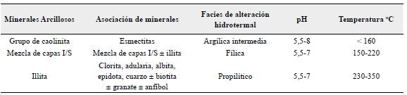 Las facies de minerales arcillosos producto de procesos de alteración hidrotermal en el sector Alto de los Godos del AGP pueden relacionarse con minerales arcillosos en ambientes hidrotermales propuestos por Fulignati (2020) (Tabla 1). Minerales del grupo de la caolinita (caolinita, halloisita, dickita y nacrita) son marcadores en las facies de alteración argílica intermedia y también pueden ocurrir en facies argílicas avanzadas; su presencia en la paragénesis de alteración hidrotermal indica relativamente baja temperatura (T <150-200°C). Por otro lado, la illita en ambiente hidrotermal se forma a temperaturas superiores a 200-200°C y hasta 350°C, como una alteración de feldespato potásico y plagioclasa.
