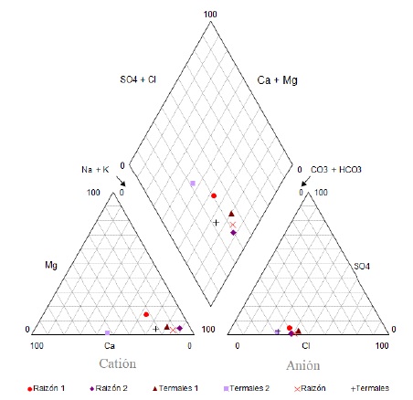 De acuerdo con el diagrama de Piper, se observa que las aguas termales del Raizón presentan valores que fluctúan entre 30% y 45% (SO4 + Cl). Los valores de Ca + Mg fluctúan entre 10% y 40%, mientras que en Los Termales T2 se encontraron valores de 55%, lo cual sugiere que en Los Termales se puede estar presentando mayor disolución de carbonatos, o que las aguas probablemente atraviesan formaciones con mayores espesores de rocas calcáreas.