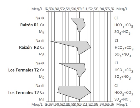 se observa que predomina una composición sódica, excepto en el Raizón R1; los porcentajes de calcio altos se presentan en Los Termales T2 y los de Mg, en general, son bajos, mientras que los porcentajes de Cl en mayor proporción se observaron en Raizón R2; los de SO4 bajos y los de HCO3 presentan mayores valores en Raizón R2 y Los Termales T2.