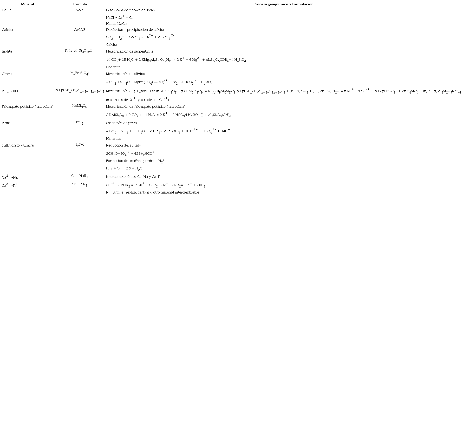 Las aguas hidrotermales tienen una composición en función de la fuente y de la interacción con el ambiente, la composición de la roca encajante, los elementos disponibles en la atmosfera, la materia orgánica, las emanaciones provenientes de magmas, las reacciones químicas entre sus componentes (Tabla 1) y los procesos físico-químicos que tienen lugar en el medio. Esta composición está influenciada por factores internos como sus componentes y propiedades, y externos como los rasgos geográficos, geológicos, hidrogeológicos y biológicos (Mijailov, 1989). Lo anterior se corrobora con lo mencionado por Güler et al. (2002), quienes sugieren que la composición química de las aguas subterráneas es controlada por factores que incluyen la composición de la precipitación, la mineralogía de las cuencas hidrográficas y los acuíferos, el clima y la topografía.