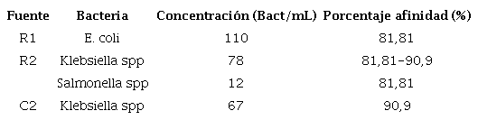 A partir de los análisis de laboratorio, los aislados positivos en la prueba Readycult 100 y medios nutritivos y selectivos, se determinó la presencia de la bacteria Escherichia coli, Klebsiella spp, Salmonella spp, en concentraciones de 110 Bact/mL. También, se identificaron otros géneros bacterianos en un rango de 12 a 78 col/mL y con porcentajes de afinidad con los géneros respectivos que oscila entre 81,81-90,90%, Tabla 2.
