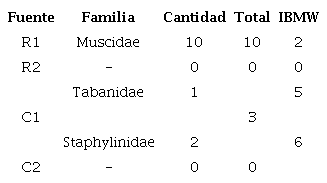 Se identificaron los órdenes Coleóptera y Díptera, correspondientes a las familias Staphylinidae, Muscidae, Tabanidae (CORTOLIMA, 2008; Hanson et al., 2010). La primera familia predomina sobre las demás y está presente en la fuente R1 del Raizón, indicativa de presencia de material orgánico en descomposición (Roldán, 1996). De acuerdo con la clasificación de la calidad del agua BMWP/COL, Tabla 4, en la fuente el Raizón (R1) y Los Termales C1 se tiene baja calidad. En R2 del Raizón y C2 de Los Termales no se identificaron macroinvertebrados.