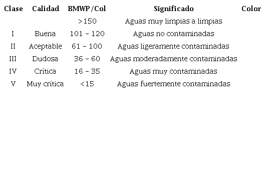 Roldán, G. (2003). Bioindicación de la calidad del agua en Colombia: Uso del método BMWP/Col.Universidad de Antioquía.
