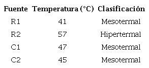 En relación con las temperaturas, se hace evidente que en el Raizón se tienen más altas temperaturas que en Los Termales, lo cual es posiblemente causado por la mayor altura de los afloramientos, que implican un mayor recorrido del agua desde la fuente. Las temperaturas medidas en el Raizón varían entre 41 y 57°C, indicativa de fuentes mesotermales a hipertermales; mientras que en Los Termales se encontraron temperaturas entre los 35-50°C, que indican que estas fuentes son mesotermales.