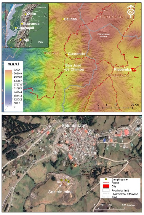 The Salinas de Guaranda sector is located in the Bolívar province, Guaranda canton, Salinas parish, northeast of the city of Guaranda (Ecuador) (Figure 1), at an altitude of 3,550 meters above sea level. It takes its name from the saltwater mines that can be found when crossing the river that runs through it and that bears the same name. Until the years 1960-1970, the exploitation of these salt mines was the main economic activity of the inhabitants of that time, complemented by agricultural work in small plots and an incipient livestock activity until the end of the 60s. Some studies have detected high Li values of 10.808 meq/L (Inguaggiato et al., 2010) to the average Li in seawater 0.18 mgL-1 (180 μgL-1, 0.026 meq/L) (Li, 1982).