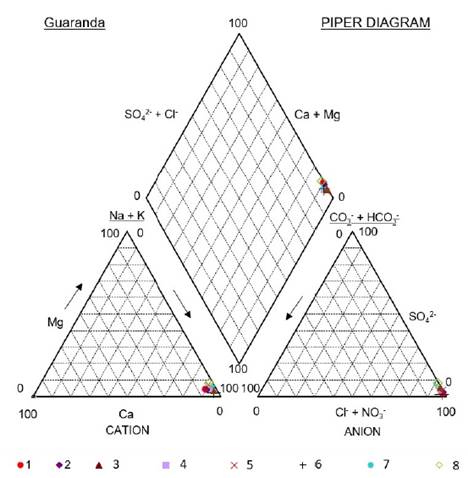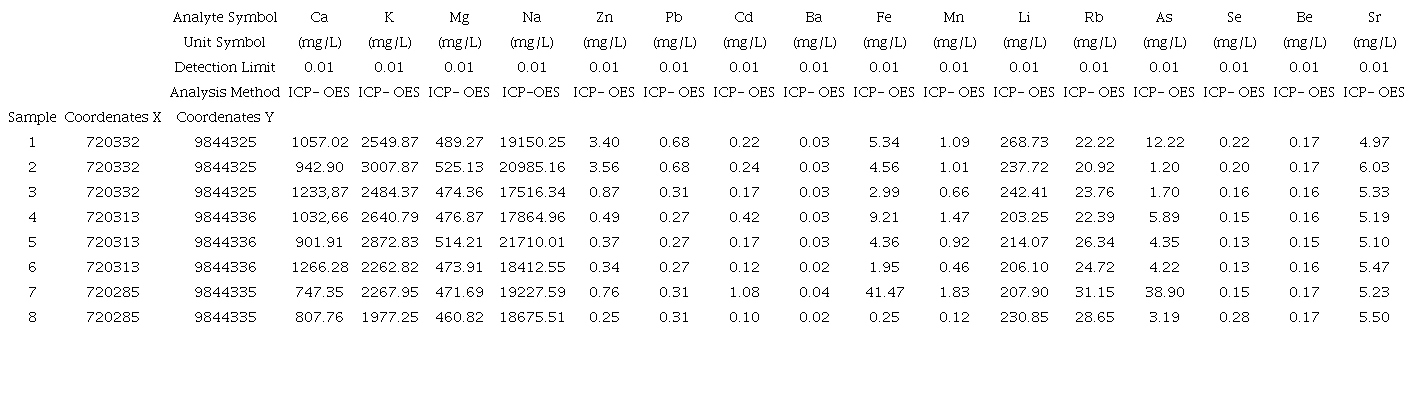 In the laboratory, the water samples were filtered by 45-micron filter paper and analyzed using Optical Emission Spectrometry with Inductive Coupling Plasma (ICP-OES) Perkin Elmer Optima 800 DV model, in the Analytical Geochemistry Laboratory of the Geosciences Department, Universidad Técnica Particular de Loja (UTPL), after calibration with certified multielement standards. In this analysis, the concentration of major, minor and trace elements was obtained: Ca, K, Mg, Na, Zn, Pb, Cd, Ba, Fe, Mn, Li, Rb, Be, and Sr. The anion analyzes (Cl-, CO32- , HCO3-, SO42-) were carried out by titration, except for sulfate (SO42-) which was analyzed by UV/VIS spectrophotometry.