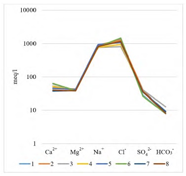 The major chemical composition of the studied brines is rather constant; brines are typically rich in Na+ and Cl−, subordinated SO42−, and relatively poor in Ca2+, Mg2+ and HCO3- + CO32−. Another fact is that in the Guaranda brines the concentrations of K+ are 4 to 6 times higher than those of Mg2+.