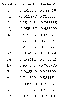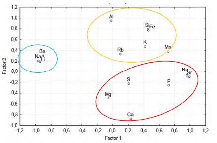 These geochemical associations are also shown in the factor analysis (Table 5). Na (-0.964), Be (-0.908) and Li (-0.945) are grouped into factor 1, indicating a similar geochemical behavior of these elements, and on the other hand P (0.724), Ba (0.957), Sr (0.985), related to phosphates, carbonates and sulfates. In factor 2, Si (0.799), Al (0.955), and Fe (0.778) are grouped, which would correspond to silicates and aluminosilicates, in addition to that factor, Ca shows an inverse behavior (-0.868), associated with carbonates, sulfates and phosphates with Mg, P, S, Ba and Sr.