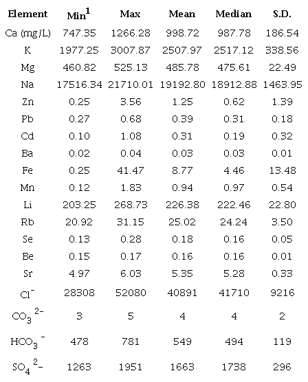 The water samples were taken from the three saline upwelling pools (hydrothermal brines) (review supplemental material for coordinates and lab results). A volume of 200 mL to 500 mL was collected per sampling point and some physicochemical parameters such as pH and, temperature were measured (in situ). Then each sample was acidified with 1.5 mL of concentrated nitric acid (HNO3) (only for the case of cation analysis) and they were refrigerated until their analysis in the laboratory. To see the complementary data, review Supplementary Table 1.