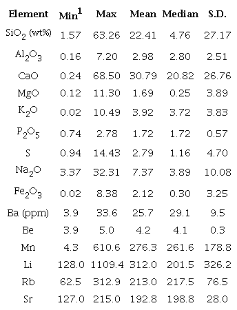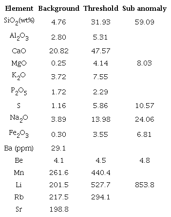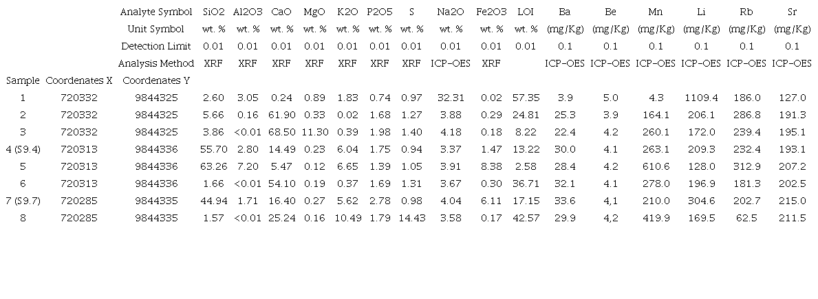 The statistical treatments of the chemical data of the Li-bearing solids of Guaranda are given in Table 2. Contents of Be, Li, and reached sub-anomalies values (median + 2 standard deviation) (Howarth, 1983), whereas sub-anomalies or anomalies of other trace elements, such as Ba, Mn, Rb and, Sr, were not detected (Table 3).