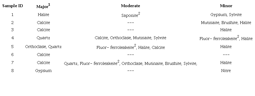 Mineralogical analysis by XRD, determined that most of the samples contain calcite, except for of sample 1 which is composed mainly of halite and saponite, and sample 8 which is composed mainly of gypsum and niter. Clay from the hectorite group, saponite, was detected in sample 1, which contains the highest concentration of Li in the study. In three samples, fluoroferroleakeite was detected, which is a sodium amphibole with Li on structure lattice (Na3Fe2+2Fe3+2Li(Si8O22)F2), which can be found in mildly peralkaline porphyry (Hawthorne et al., 2001). Additionally other mineral phases were identified as quartz, orthoclase, sylvite, brushite and mutinaite, in general silicates, chlorides and phosphates.