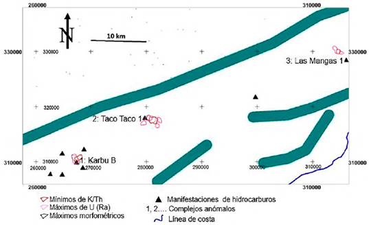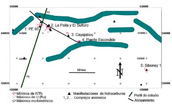 En la espectrometría gamma aérea (EGA), los depósitos de hidrocarburos se expresan por mínimos de K y de la relación K/Th, rodeados de máximos; y de forma mayoritaria, en su periferia, se observan incrementos locales del U (Ra) (Pardo-Echarte y Rodríguez, 2011, 2016; Pardo-Echarte et al., 2019, 2022; Morales-González et al., 2020, 2022).