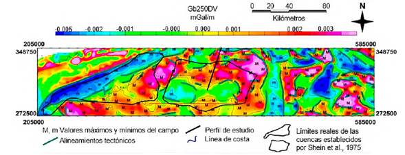 A juzgar por la información geológica y geofísica pretérita, según Shein et al. (1975), los límites reales de las cuencas y subcuencas conocidas abarcan tanto zonas de valores mínimos y campo no anómalo como zonas de valores máximos (Figura 2 y 3) (Shein et al., 1975). No obstante, se decidió ofrecer (Figura 3) una versión de los posibles límites de las partes más profundas a partir de los datos gravimétricos.
