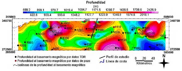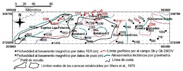 La profundidad al basamento magnético (Terreno Zaza) para la región de estudio se determinó a partir de la aplicación del método magnético de inclinaciónprofundidad en puntos de interpretación aislados (datos TDR), y a partir de la consideración de los datos de pozos en el área (Figura 5).