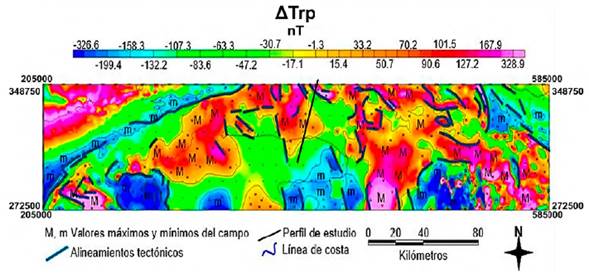 La litología magnética (rocas volcánicas y complejo ofiolítico) se distingue de forma directa sobre la base de las observaciones del campo magnético a escala 1:250 000 reducido al polo (ΔT250rp) y su primera derivada vertical (ΔT250rpDV); los alineamientos tectónicos son trazados a partir del mapa de la derivada horizontal del campo magnético a escala 1:250 000 reducido al polo ΔT250rpDHT. En la cartografía geólogo-estructural con base en datos magnéticos, los máximos están asociados a la presencia de rocas volcánicas y ofiolitas del Terreno Zaza, y los mínimos y/o el campo no anómalo, a las depresiones estructurales (Figura 4). Las estimaciones cuantitativas de la profundidad de objetivos magnéticos bajo los sedimentos se realizaron a partir de la derivada de la inclinación del campo magnético (TDR-ΔT250rp). Se previó que el campo ΔTrp permitiría la cartografía de muy sutiles máximos magnéticos locales asociados con la posible presencia de óxidos de hierro con presumible interés gasopetrolífero en sectores terrestres (Morales-González et al., 2020, 2022; 2022; Pardo-Echarte y Rodríguez-Morán, 2022).