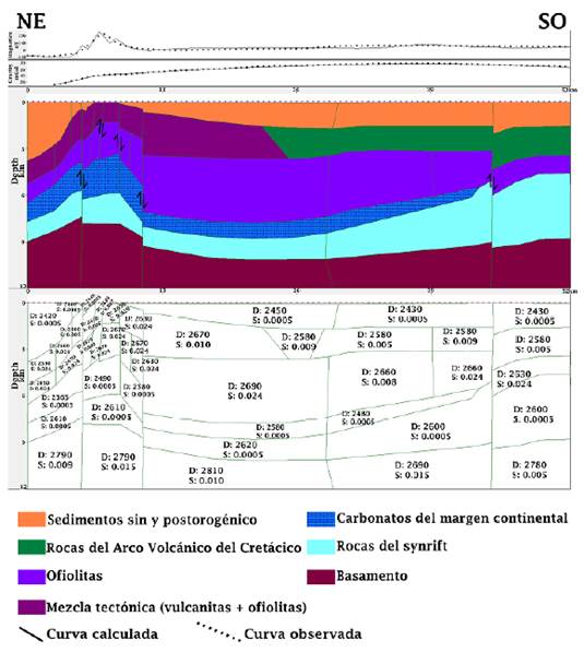 Los resultados del modelado físico-geológico 2D de campos potenciales por el perfil de estudio se presentan en la Figura 6. El modelo físico-geológico 2D refleja, en esencia, la base y el tope de los principales paquetes rocosos, mostrando su envolvente. Los mismos simplifican las características geológicas presentes, agrupando varias formaciones plegadas y cabalgadas. El modelo geológico fuente de la versión inicial para el modelado fue trazado a partir de las consideraciones hechas por el ingeniero Carlos Valdivia Tabares (comunicación personal), las cuales se sintetizan de la siguiente manera:
