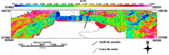 A partir de los datos de la espectrometría gamma aérea (EGA) se obtuvo el mapa de la relación potasio-torio (K/Th) (Figura 7).