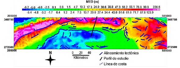 Los resultados de la cartografía morfométrica por datos del MED a 90 m se presentan en la Figura 8. En esta han sido trazados los alineamientos tectónicos por morfometría, donde el índice morfométrico no convencional utilizado para el trazado de los alineamientos tectónicos fue el de la Derivada Horizontal Total (DHT=sqrt [DX2+DY2]). Llama la atención el comportamiento de una gran parte de la costa sur con carácter tectónico.