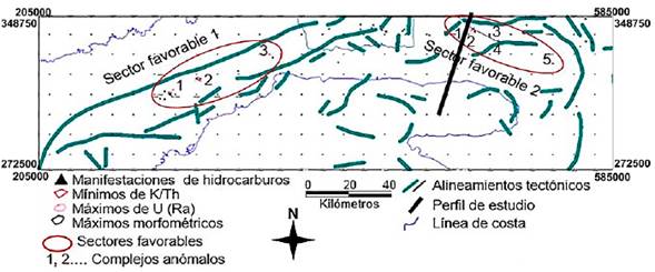 Cartografía prospectiva integrada y sectores favorables en sectores terrestres: en la cartografía prospectiva integrada, con el fin de establecer los sectores favorables para la ocurrencia de hidrocarburos, se consideraron los resultados de la cartografía EGA junto con los máximos locales morfométricos (atributos indicadores, a escala 1:50000), en el marco de una selección de alineamientos tectónicos, fundamentalmente gravimétricos, y de las manifestaciones de hidrocarburos del territorio (a escala 1:250.000).