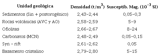 Los valores petrofísicos para el modelado 2D de campos potenciales (Pérez-Delgado et al., 2015; Pardo-Echarte, 2016) se resumen en la Tabla 1.