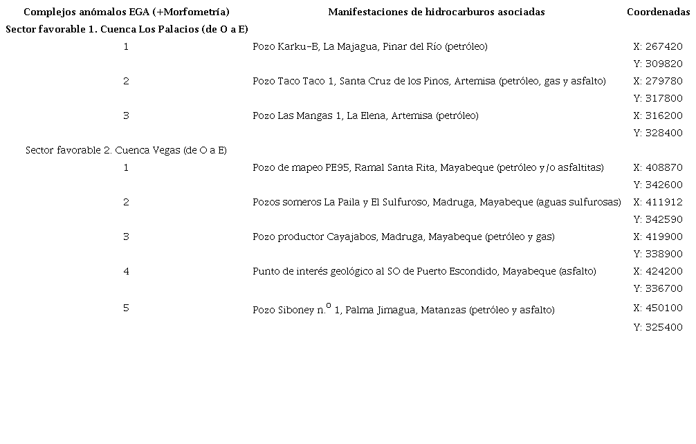 Los resultados de la cartografía prospectiva integrada, en el marco de las manifestaciones de hidrocarburos y alineamientos tectónicos del territorio (de manera fundamental gravimétricos) (Figura 8), contemplan un grupo de tres complejos anómalos EGA (sector favorable 1) (Figura 9), dos de estos con anomalías morfométricas asociadas, en la región de la Cuenca Los Palacios (entre dos fallas por gravimetría), y un grupo de cuatro complejos anómalos EGA (sector favorable 2), asociados a una falla por magnetometría, de rumbo NO-SE, en la región de Madruga, Cuenca Vegas. Los detalles se presentan en las Figuras 10 y 11 y en la Tabla 2, donde se ofrecen las principales características de las manifestaciones de hidrocarburos asociadas a cada complejo anómalo EGA.