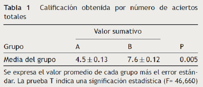 Por otro lado, la frecuencia de aciertos es superior en los alumnos de ciclos clínicos que en el grupo de alumnos de primer año, lo cual es reforzado al considerar la media del valor sumativo del cuestionario en donde la "calificación" es significativamente superior en el grupo B.