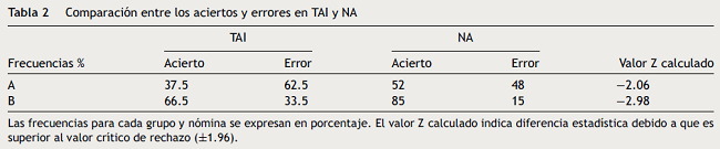 Al analizar la frecuencia de aciertos por nómina encontramos que el grupo B obtiene mejor porcentaje de aciertos tanto para TAI como para NA (66.5 y 85%).