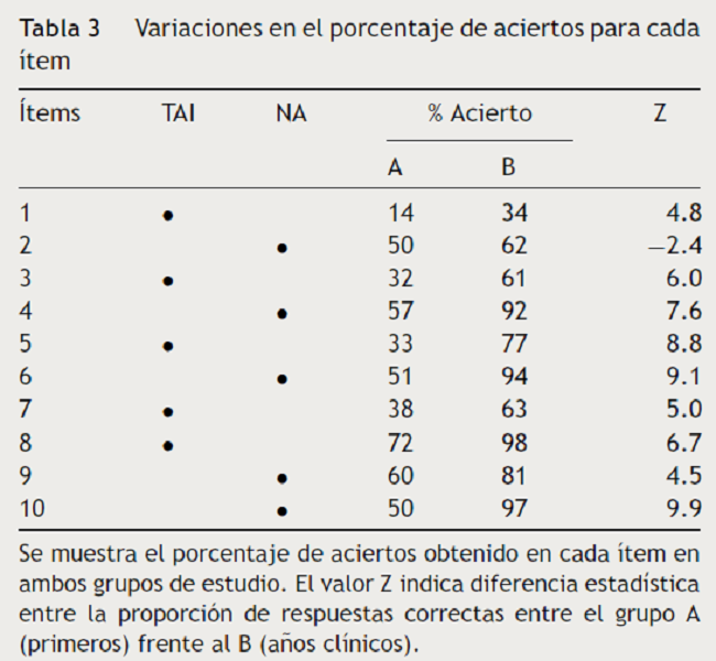 La frecuencia de aciertos para cada ítem del cuestionario se observa en la tabla 3. Encontramos que en todos los ítems el porcentaje de aciertos es significativamente mayor en el grupo B.