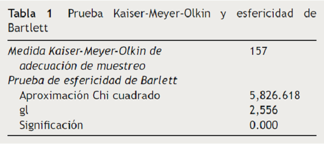 Para medir la validez del cuestionario aplicado a los estudiantes de Medicina se utilizó el análisis factorial como se detalla a continuación. Se busca primero una solución inicial con el análisis Kaiser-Meyer-Olkin y la prueba de esfericidad de Bartlett con el método de extracción de componentes principales y escogiendo la opción sin rotación ( tabla 1).