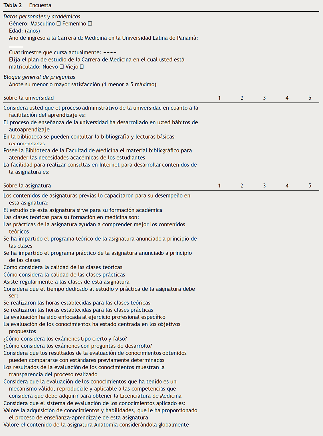 Resultados: La encuesta tiene varias fortalezas: a) poco onerosa y de aplicación fácil; b) naturaleza impersonal; c) el anonimato de la misma, junto con la ausencia de los docentes implicados en la asignatura evaluada, garantiza la libertad de respuesta, y d) no está ajustada a realizar en un tiempo determinado, lo que facilita las respuestas del estudiante.