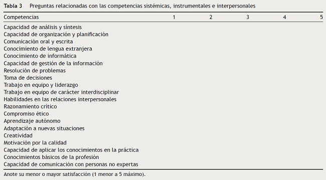 El tercer bloque es específico de preguntas relacionadas con las competencias sistémicas, instrumentales e interpersonales.