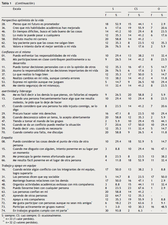 a) Con respecto a las percepciones que los estudiantes tienen sobre sus habilidades en situaciones que implican interactuar con otras personas, se observó que aproximadamente el 30% de ellos todavía no muestran consolidado esto en el desarrollo de su autoestima, autoconocimiento y expresión emocional, así como en su habilidad para la autocrítica y heterocrítica, confianza en sí mismos, asertividad y liderazgo, y trabajo y apoyo en equipo. Lo anterior puede explicarse por circunstancias personales, como la edad y el proceso de independencia personal, entre otros, lo que coincide con el punto de vista de Williams y Deci10.