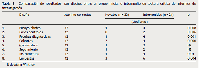 Se compararon los grupos novato e intervenido (G1 y G2) en los 3 indicadores y resultados globales (G1 Mdn: 11 y G2 Mdn: 29), así como en los 8 diseños referidos antes. En todos los indicadores de la lectura crítica y por diseño de artículo, hubo diferencias estadísticamente significativas a favor del G2, excepto en interpretación y los diseños de metaanálisis y seguimiento (tablas 1 y 2).