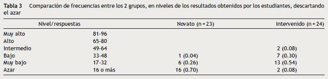 Cuando se comparan las respuestas, descartando el azar, en ambos grupos y en las categorías respectivas, se observó una frecuencia más alta en el azar en el G1 (tabla 3).
