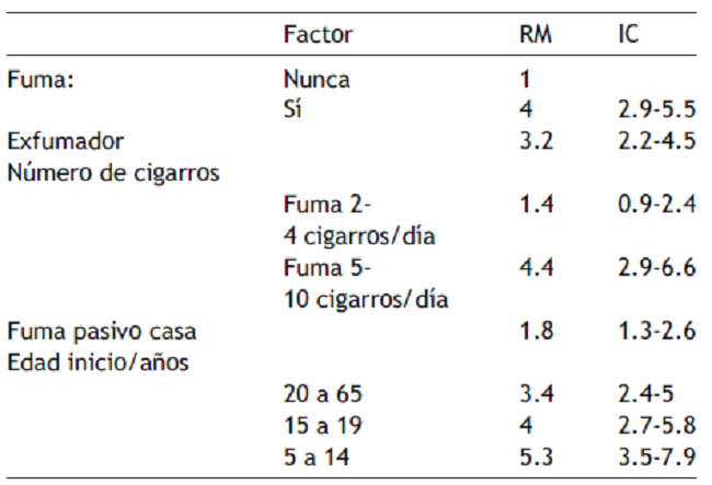 El objetivo del estudio es identificar la relación del cáncer de pulmón con el fumador pasivo y activo, entre otros factores. Se estudiaron 385 pacientes con diagnóstico de cáncer pulmonar, confirmado por patología, en hospitales de tercer nivel. Un grupo de 898 individuos sanos, de la comunidad, se estudió con una encuesta multietápica, aleatoria, con estratos por edad. A ambos grupos (relación 1:2) se les aplicó un cuestionario por 2 entrevistadores entrenados que desconocían el motivo del estudio. Contenía preguntas sobre exposición al tabaco, activa o pasiva, número de cigarrillos al día y edad de inicio (si fumó). Los datos fueron capturados 2 veces y analizados en SPSS. Se utilizó la relación de momios (RM), en cálculo bivariado, con un intervalo de confianza (IC) del 95%.