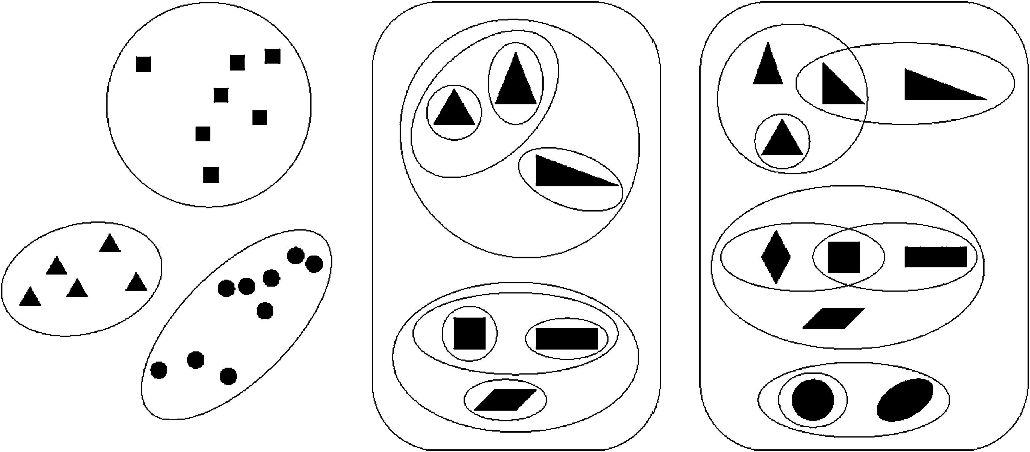 (a) Los que implican una partición de los elementos, es decir, una clasificación en la cual cada elemento pertenece precisamente a un grupo; matemáticamente hablando, en una partición los grupos son exhaustivos y mutuamente excluyentes.