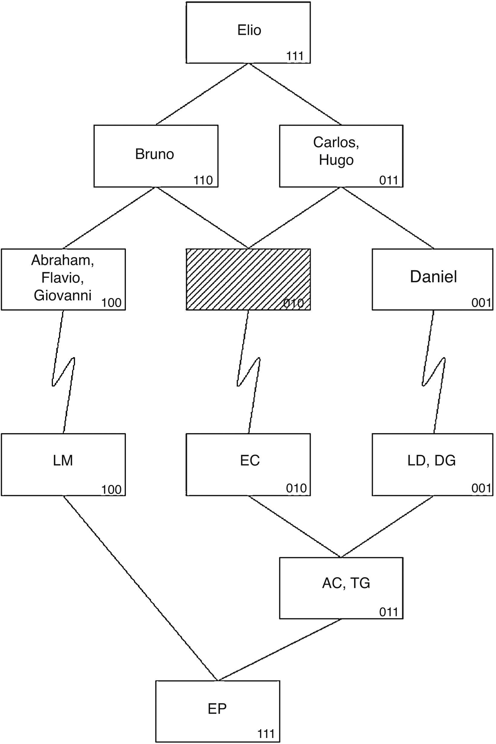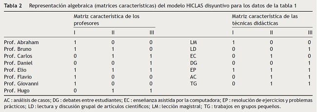 Si dos profesores (o dos técnicas didácticas) están jerárquicamente relacionados, entonces, el que es jerárquicamente inferior carga en un subconjunto de las características en las que carga el jerárquicamente superior. Por ejemplo, Bruno, quien está debajo de Elio, carga solo en las características I y II, mientras que Elio carga en las tres. Similarmente, observamos que las técnicas didácticas LD y DG cargan en la característica III y que las técnicas AC y TG, que son jerárquicamente superiores, incluyen además de la característica III, también la II. Además, la relación de asociación se deriva a través de la siguiente regla: si un profesor y una técnica didáctica tienen una (o más) características en común, están asociados. Por ejemplo, el profesor Abraham comparte la característica I con las técnicas LM y EP y, por consiguiente, considera estas técnicas como adecuadas; Abraham no está asociado con las otras técnicas, debido a que estas no cargan en la característica I (la única con la que Abraham está asociado). Se puede verificar que estas y otras derivaciones coinciden perfectamente con los datos de la tabla 1.