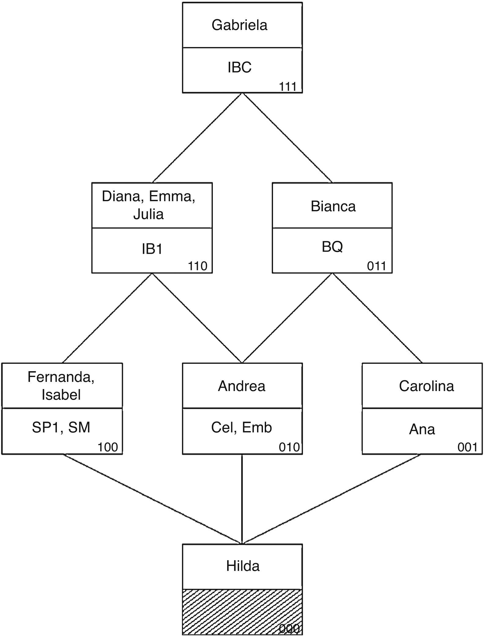 Debido a que la variante conjuntiva representa las relaciones estructurales de una manera distinta al modelo disyuntivo, la forma de construir y leer la representación gráfica difiere en algunos aspectos. En la figura 3, que muestra la gráfica del modelo HICLAS conjuntivo para los datos de la tabla 3, se observan pares de cajas, donde la caja superior de cada par representa una clase de los objetos (estudiantes) y la caja inferior una clase de los atributos (materias). Se deriva de esta figura que Diana, Emma y Julia forman una clase de estudiantes equivalentes (es decir, aprobaron las mismas materias, lo cual se puede verificar en la tabla 3). Asimismo, las materias equivalentes Biología Celular y Embriología se encuentran dentro de la misma caja en la figura 3. Respecto de las relaciones jerárquicas, se observa que la clase de estudiantes {Diana, Emma, Julia} se encuentra jerárquicamente superior a las estudiantes {Fernanda, Isabel}, lo cual significa que las primeras aprobaron todas las materias que aprobaron Fernanda e Isabel (SP1 y SM) y además aprobaron otras (Cel, Emb y IB1). Las relaciones jerárquicas entre los atributos se leen de forma similar, tomando en cuenta que las (clases de) materias que se encuentran arriba en la representación gráfica, son jerárquicamente inferiores. Por ejemplo, IBC, que se representa en la parte superior de la gráfica, es jerárquicamente inferior a todas las otras materias (es la materia menos aprobada de todas). Finalmente, la relación de asociación entre estudiantes y materias se lee fácilmente como sigue: la estudiante está asociada con todas las materias que se encuentran en posiciones inferiores a ella en la gráfica (ya sea dentro de la misma caja o en una caja inferior a la cual se puede bajar a través de las líneas). Por ejemplo, se lee que Diana, Emma y Julia aprueban las materias de Informática Biomédica I, Salud Pública I, Salud Mental, Biología Celular y Embriología.