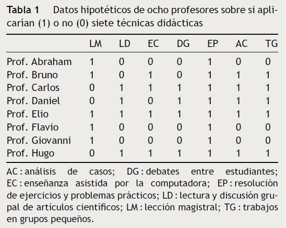 El modelo disyuntivo original analiza una tabla de objetos (filas) y atributos (columnas) cuyas celdas tienen valores iguales a 0 o 1. La tabla 1 muestra unos datos hipotéticos que servirán para ilustrar los conceptos en esta sección; representan las técnicas didácticas que ocho profesores del posgrado consideran adecuadas para utilizar en clase. En este ejercicio, se consideran las siguientes siete técnicas: lección magistral (LM), lectura y discusión grupal de artículos científicos (LD), enseñanza asistida por la computadora (EC), debates entre grupos de estudiantes (DG), ejercicios y problemas prácticos (EP), análisis de casos (AC), y trabajos en grupos pequeños (TG). Los profesores son los «objetos», las técnicas didácticas son los «atributos». Si un profesor considera adecuada una técnica, entonces la celda correspondiente muestra el valor de 1; en caso contrario, el valor es 0.