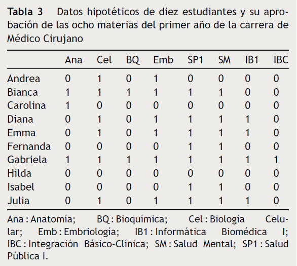 Para guiar el desarrollo en esta sección, se utilizarán los datos en la tabla 3, que indica para cada una de diez estudiantes del primer año de la carrera de Médico Cirujano de la UNAM, cuáles de las ocho asignaturas aprobó (digamos, a través de los exámenes parciales). Si la estudiante aprobó la materia, entonces el valor en la celda correspondiente es igual a 1; en caso contrario, se da el valor de 0.