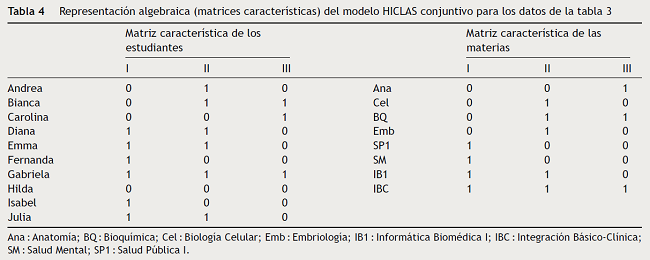 La tabla 4 muestra las matrices características correspondientes al modelo HICLAS en la figura 3. Se observa que se trata de un modelo de rango 3, ya que dichas matrices tienen tres columnas. En cuanto a la representación de las relaciones estructurales, se destaca lo siguiente: similar al caso del modelo disyuntivo, los objetos y atributos equivalentes tienen el mismo patrón en las tres características, por ejemplo, las tres estudiantes equivalentes Diana, Emma y Julia cargan en las características I y II. También la relación jerárquica para los objetos (estudiantes) se lee de la misma forma que en el modelo disyuntivo: si la estudiante A es jerárquicamente superior a la estudiante B, entonces las características en las que B carga forman un subconjunto de las características de A. Por ejemplo, Fernanda e Isabel cargan solo en la característica I (un subconjunto de las características de Diana, Emma y Julia). Sin embargo, la representación de la relación jerárquica para los atributos en un modelo conjuntivo es distinta en comparación con el modelo disyuntivo: en el contexto de nuestro ejemplo, si la materia A es jerárquicamente superior a la materia B, entonces las características en las que carga A son un subconjunto de las características de B. Por ejemplo, la materia de Anatomía, la cual es jerárquicamente superior a Bioquímica (tabla 3), carga solo en la característica I, mientras que Bioquímica carga tanto en la característica I como en la II.