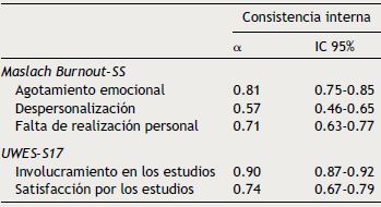 En el estudio de Glaría et al.1, estimaron la confiabilidad de los puntajes con el coeficiente α de Cronbach, procedimiento que cuantifica el error de medida al aplicar un instrumento de evaluación. Los resultados indican un bajo coeficiente α aún para efectos de investigación (α ≥ 0.70)2 en la dimensión Despersonalización del MBI-SS (0.57),y para la dimensión Falta de realización personal (0.71) del MBI-SS y Satisfacción con los estudios (0.74) del UWES-S17 los α están cercanos a ese límite.
