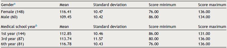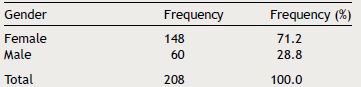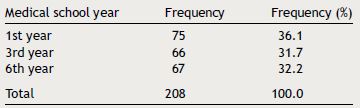 The final sample was composed of 208 students who represent 66.6% of the population (Table 1). There were 148 females (71.2%) and 60 males (28.8%) and the age mean of the students was 21.38 years and standard deviation 2.77. Considering the years of enrollment, students are distributed as follows: 75 in the 1st year, 64 in the 3rd year and 67 in the 6th year.