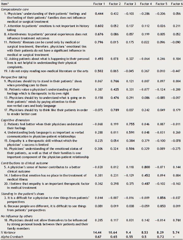 The factors 1, 2 and 5 are interpreted as constructs “compassionate care”, “perspective taking” and “standing in the patient shoes”, very well supported by the literature review. The factor 1, which accounted for 14.44% of the variance, can be labeled as “compassionate care” based on the contents of the six items (1, 7, 8, 11, 12, 19). All these items also emerged as the compassionate care factor in the others studies,510161819 except for the item 19.